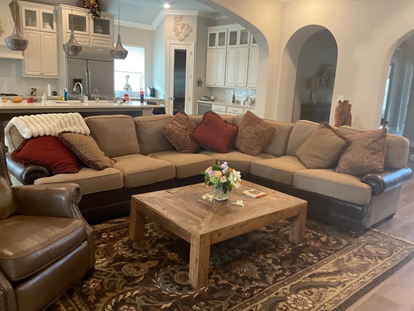 This is an incredible find. No wear, beautiful sofa with leather accents. The color will fit any decor. Numerous accent pillows set it off beautifully. Paid $15,000 from Bartholet.