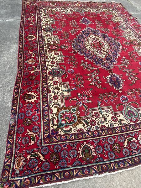 This is a true Persian, Iraq, Oriental rug made of wool. Supposedly was in an United Stated Ambassador’s residence before I bought this about 18 years ago (I used it for about 8 years) and it has been in climate-controlled storage until a week ago. It was professionally cleaned when I bought it and before storage. I pulled it outside to take these pics and its back inside our home. The tag on the back, which is gone, stated the dimensions and origin (Persia, Iraq and approximate date of it being made 1954-1962).