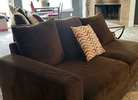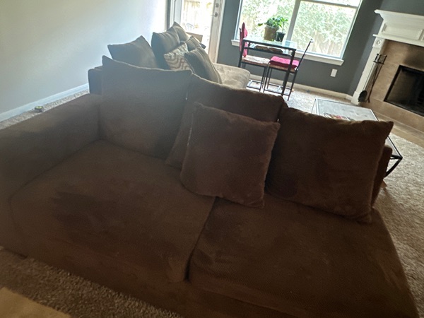 Brown 2 piece Sectional with 4 small Pillows that can be covered to any color.