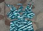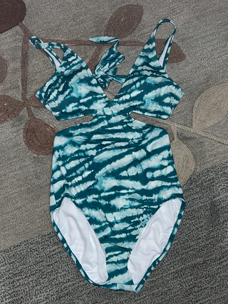 One piece suit with cutout sides, women's size medium, high waist, adjustable back tie, removable cups. Brand is Beach Betty. New with tags from smoke-free home. $10