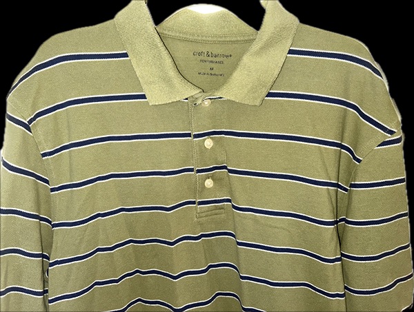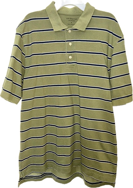 Men's size medium, horizontal striped, polo style short sleeve shirts. Very good condition with minor wear/fade but no known holes, tears or stains. Green is a Kohl's brand, gray is St. John's Bay brand. Smoke free home. $5/both