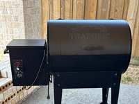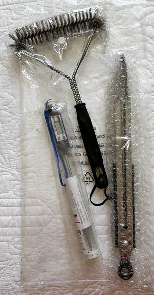 Polyester, black, hook and loop closure, 52”x24”x44”. Includes tongs, thermometer, and brush NEVER USED that accompanied purchase. Currently sold on Amazon for $40.
