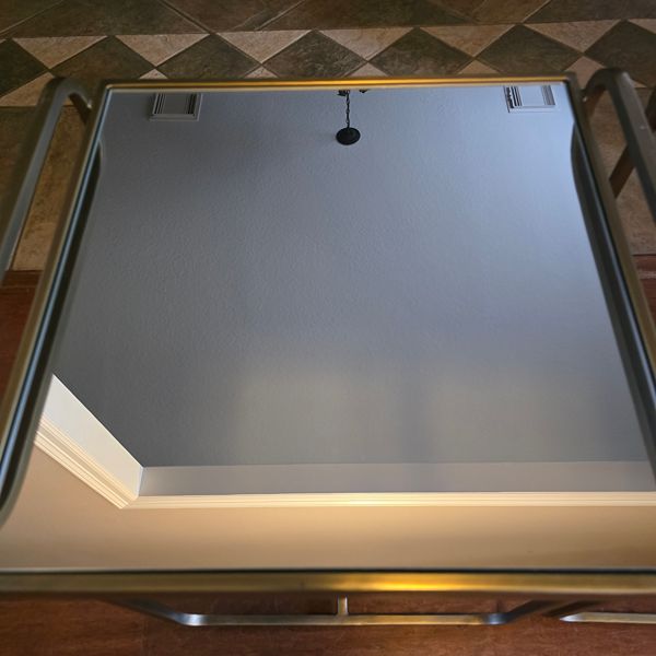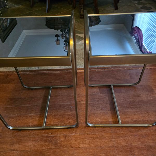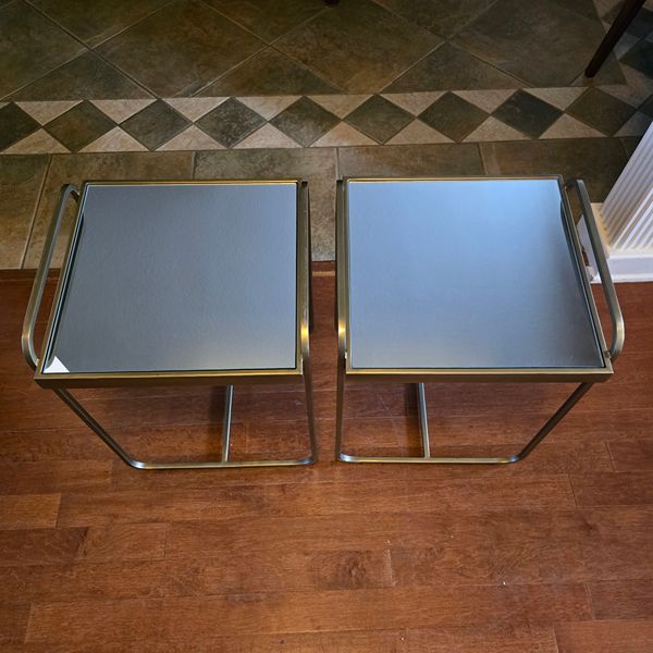 Two Roark Antique Brass End Tables. Measures 16 inches long 16 inches wide and 21 1/2 inches tall. Located in The Woodlands 77381. Crossroad kuykendahl road and research forest drive. Delivery is available for a fee.