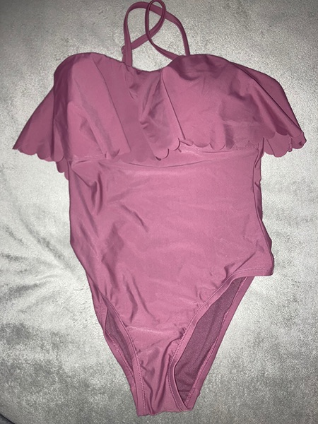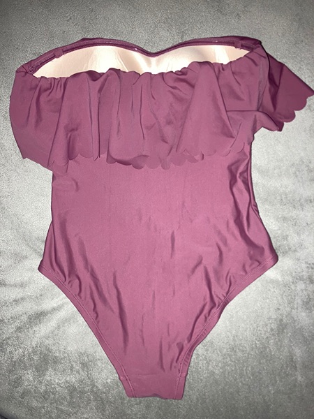 Brand is Kona Sol, size is medium (8-10), color is mulberry. Flounce front, removable straps, sewn in cups, medium coverage. New with tags from smoke free home. $10