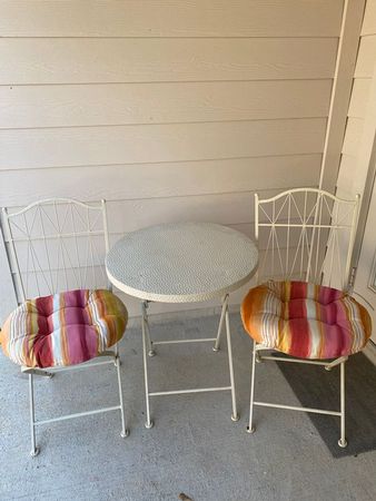 Three piece patio set: round metal table, two chairs, and multi-colored seat cushions