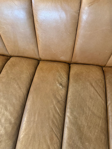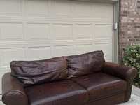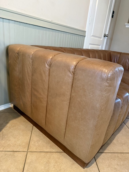 Crate & Barrel 80” Sofa with a walnut base. It’s is gorgeous in person. There’s signs of wear and some area are little worn (see pic) but no tears. Great for kids and dogs- really easy to clean up. Real leather.
