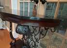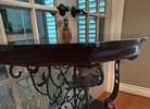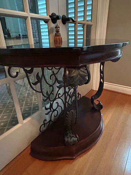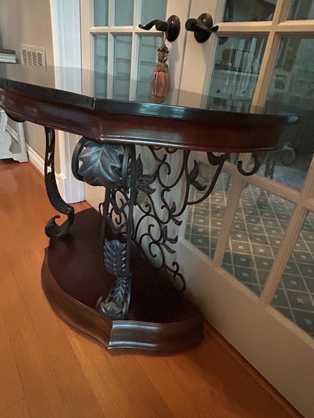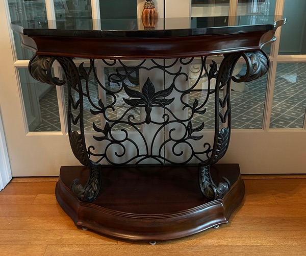 Demilune console table featuring a black marble top and base that is wood with an ornate wrought iron scrollwork frame.