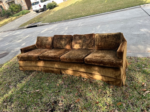 Brown velvet couch. If you have the time and what it takes to clean a beautiful antique couch, come get it before bulk trash pickup takes it. It has been stored in garage. If the post is removed, it's been picked up. Sitting at the curb.
