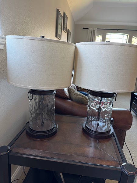 Set of 2 Glass cylinder table lamps, 25 inches tall with shades, 16 inch diameter with shades.