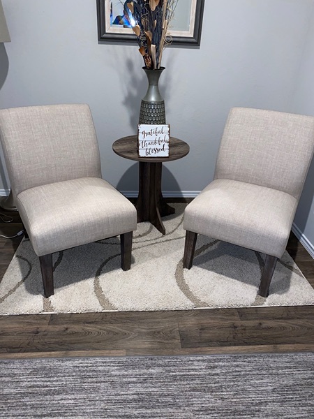 Entry room two wheat-colored chairs, matching gray-tone table, and 8ftx4ft area rug.