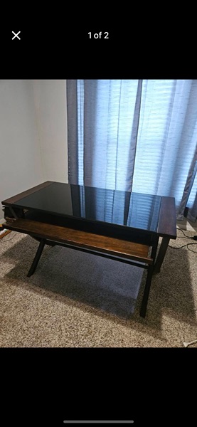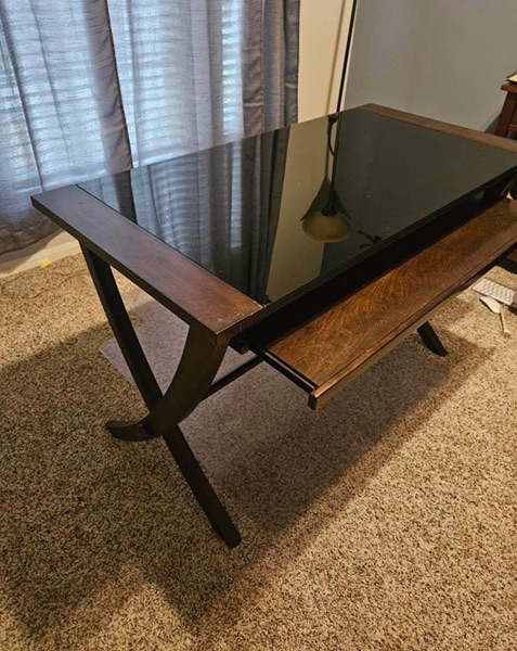 Contemporary desk. Real wooden frame with glass insert, and keyboard tray. In great condition.