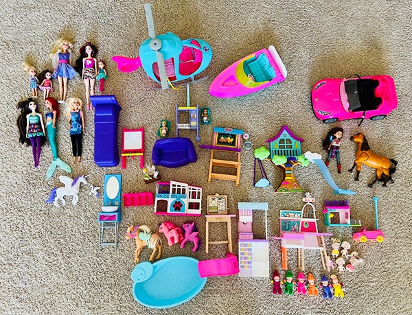 See both photos! Includes everything you see, plus the Barbie restaurant set, which folds up for easy storage. Everything is in good condition, except the pink car is missing a small side mirror. I don’t have all of the little accessory pieces for the sets, but these can be used with any accessories that you have. $50 for everything, porch pickup in The Woodlands.
