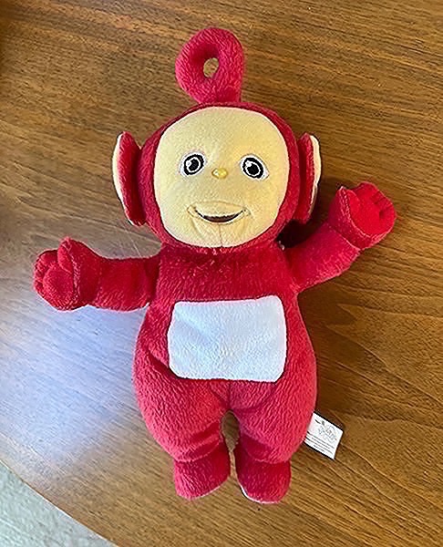 Squeeze Po’s hand and he will play Twinkle Twinkle Little Star and Rock-a-bye Baby. His tummy lights up when playing songs. Approx. 12” x 9”. Made by Ragdolls in 2007. He has dried glue in a few spots from being glued to a poster board (see pic. Doesn’t affect play and could possibly be removed with heat or glue solvent)…$15 firm