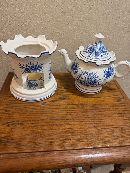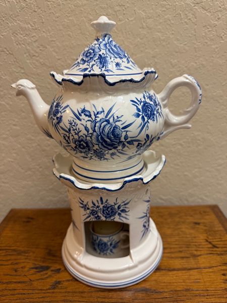 Elegant blue floral design teapot with matching warmer ** Made in Japan by Original Arnart Creation ** Like new conditon except for small area on spout of teapot