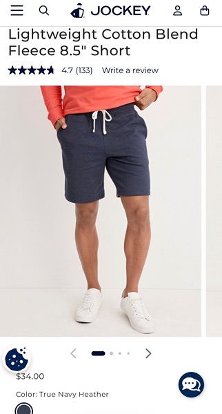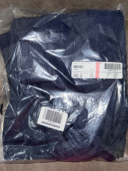 Jockey men's cotton blend fleece shorts, 8.5" inseam, navy heather color, size large. Very soft, with pockets and drawstring waistband. New in package from smoke free home. $15