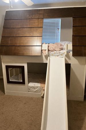 Selling our custom house-style loft bed with slide. Solid, sturdy, and SUCH a cool setup for a kid’s room.