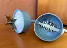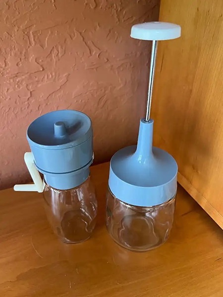 -vintage GEMCO hand chopper The top has a hand pump which you would push down in order to chop or mix the contents in the jar. Includes a round hard plastic disk that lays on the bottom of the jar when you are chopping to protect the glass.