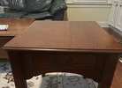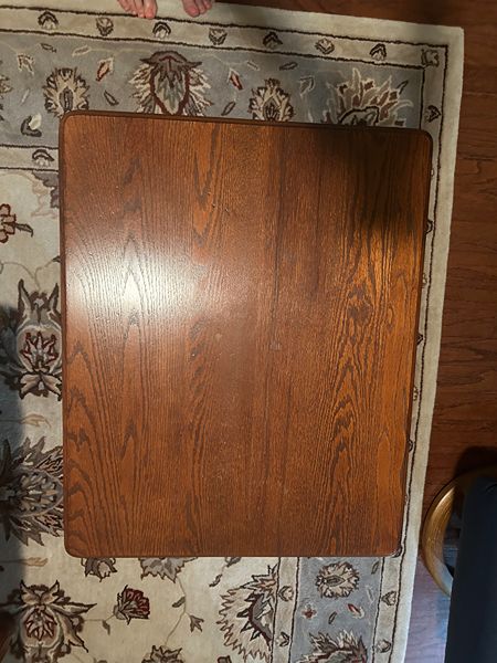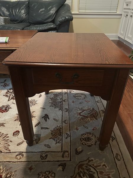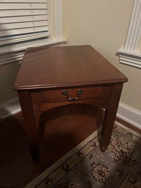 Solid wood end table. Approximate dimensions 26" long, 21" wide, 22" high. Has working drawer for storage.