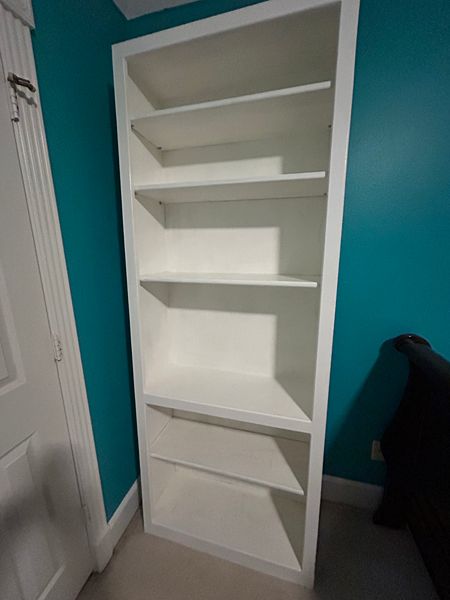 This is a white, real wood bookshelf. It could use some sanding and a new coat of paint, but much more durable than the options from IKEA. Approximate dimensions 84" high, 32" wide, 12" deep.