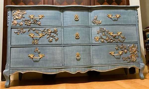 - We cleaned, filled, sanded, primed, added texture then muted blue glazes in layers, Hand poured moulds of magnolias then attached, finally we gilded and sealed for durability.