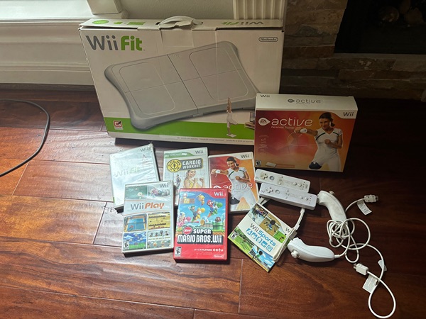 Wii fit board plus Wii fit and cardio workout discs. originalWii fit active.Original Super Mario bros disc, Wii play and Wii sport. All connecting cables. Unfortunately our console broke. I am happy to include that but it does need repairing.
