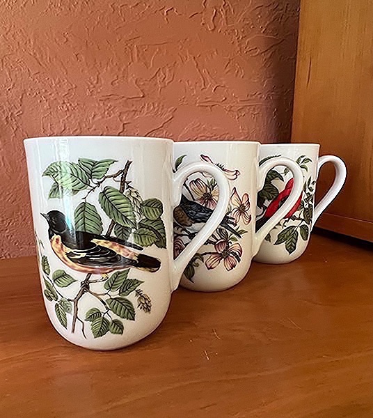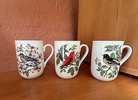 Featuring birds and flowers. Each measures approx. 4" high, 4" rim to handle, 2 3/4"diameter at mouth.