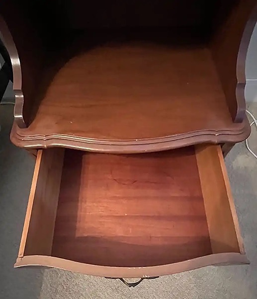 Elegant, French Provincial solid wood end table or nightstand with drawer and open shelf.