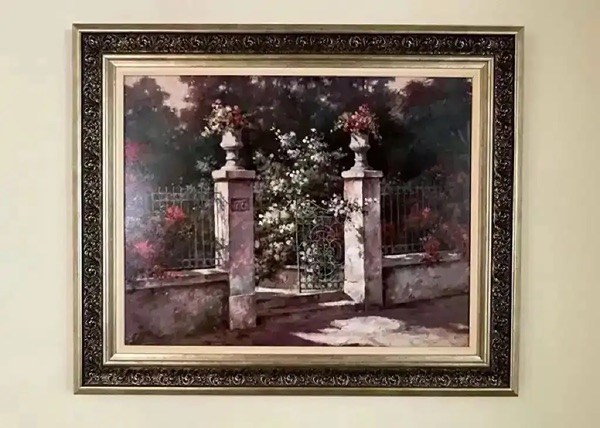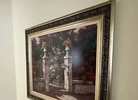 Large elegant framed painting of a garden scene with ornate border. Approx. 34” x 28”…discounted to $20 firm!