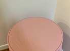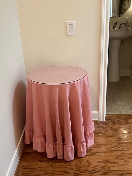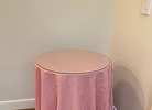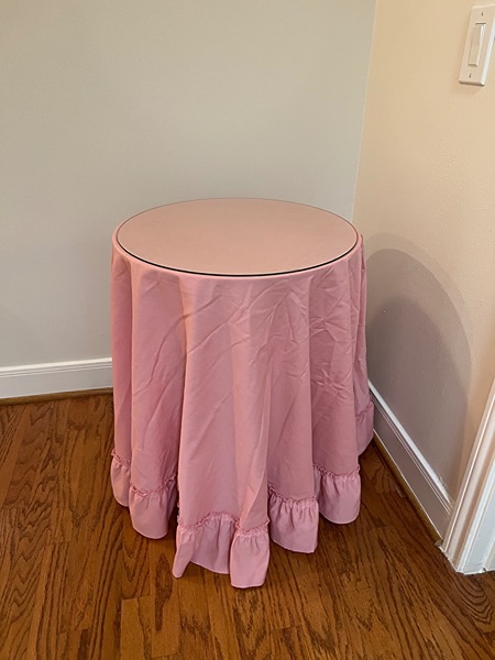 Classic Three-Legged Skirted Side Table for Use in Bedroom, Living Room or Entryway with pink tablecloth and glass top. Approx. 20” round and 26” tall…$15 firm