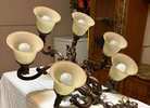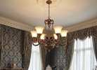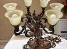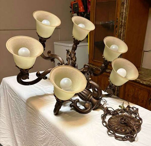 Elegant Mediterranean-style (Tuscan-style) chandelier, like new. Made of iron and a bronze alloy with a dark, textured "oil-rubbed bronze" finish, giving it a deep brown color with coppery undertones. It features six curved arms that hold the lights, with ornamental scrollwork and stylized leaf details on the central body and arms. Includes a thick chain and a ceiling canopy (the round piece that attaches to the ceiling) with the same finish and decorative design as the rest of the chandelier. Approximate dimensions: Height 45”, Width 29”, Base 10”. The shades (in the shape of an inverted tulip) are made of frosted glass with a soft amber tint, which helps to diffuse the light and create a warm ambiance. It comes with the wiring and chain ready for installation. This type of chandelier is ideal for a dining room, entryway, or living room with classic decor.
