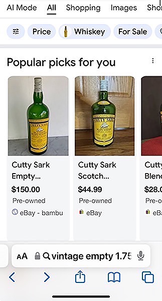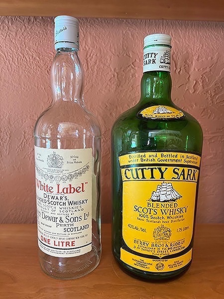 One litre Dewar's White Label and 1.75 litres Cutty Sark bottles…$10 firm
