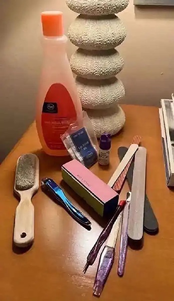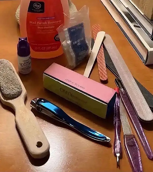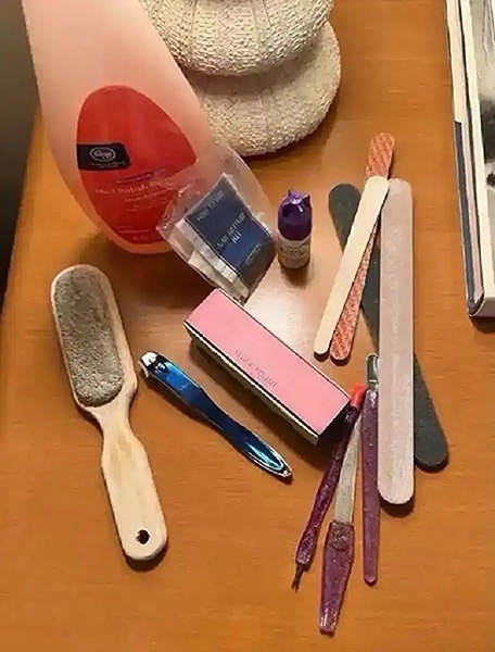 Includes nail polish remover (about half full), nail repair kit, nail glue, pumice stone, nail files, clippers, buffer, and other tools…$10 firm