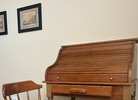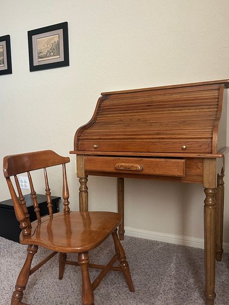 Nice secretariat desk, convenient as a writing desk or as a laptop desk. Dimensions 32W, 24D, 42H. Has handy drawers and compartments for storage and organization. Lid closes to keep things out of sight if desired. Wooden chair is included.