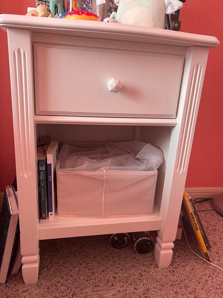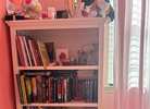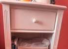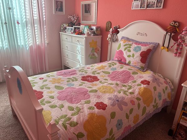 4 piece Pottery Barn bedroom set for children, White color. Set includes full size bed (mattress included), night stand, dresser, and bookcase.