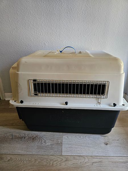 Small pet carrier for puppy or small dog. Original handle is broken, but zip tie works.