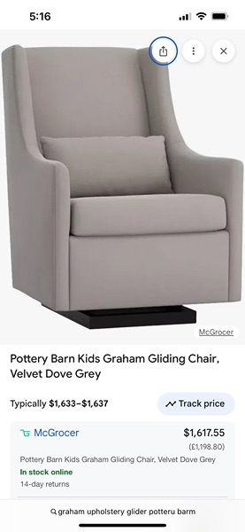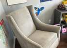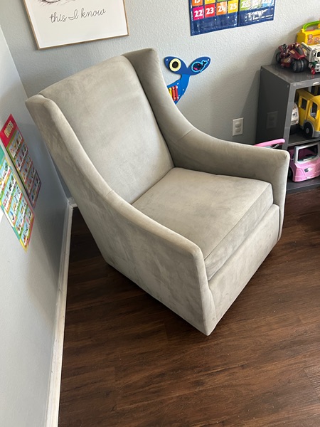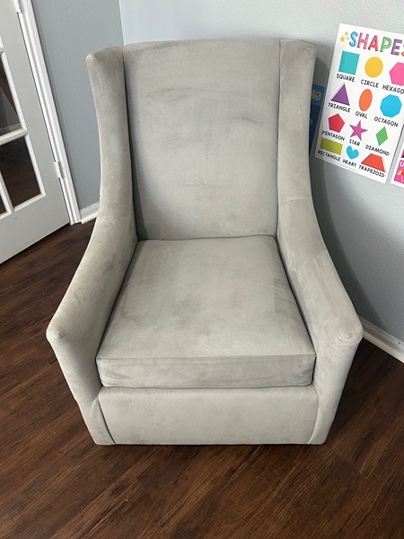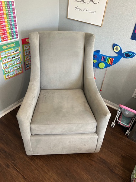 Potterybarn graham wingback glider in excellent condition! No stains or rips the material is a velvet, neutral, gray color very easy to spot clean! Does not recline is only a glider perfect for a nursery retails over $1500
