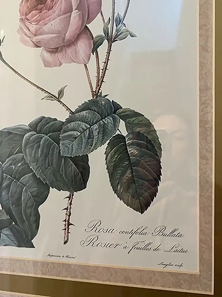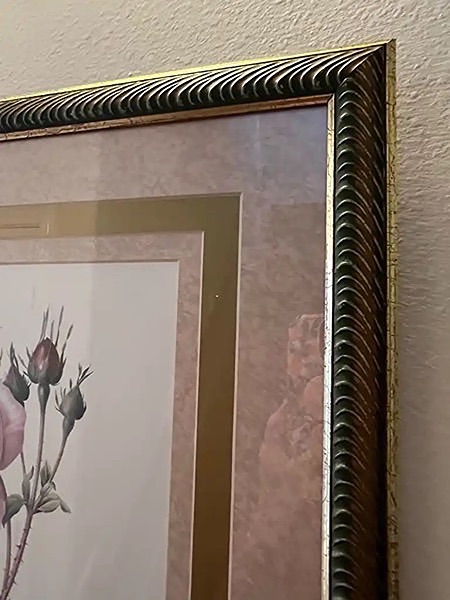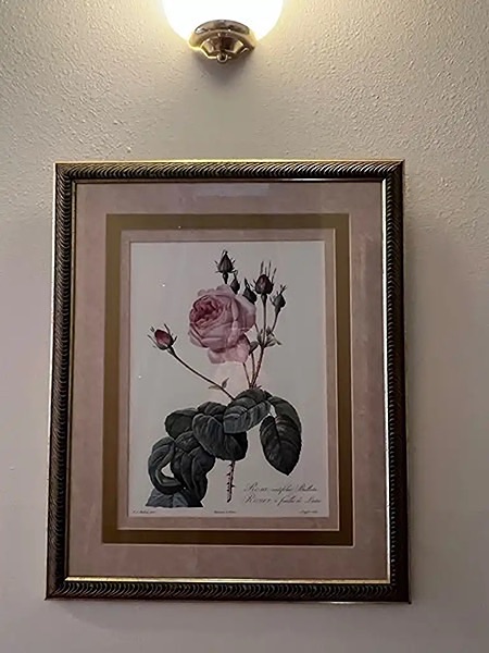 Elegant framed botanical print of a rose with gold accents. Approx. 22 1/2” x 18.25”. Slight blemish in one area, hard to notice (see last pic)…$15 firm