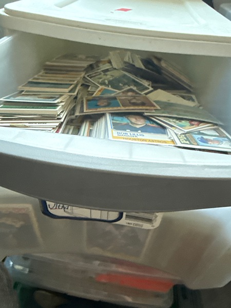 Large box of random baseball cards left by a tenant. There's probably about 3000 cards in here. I don't know anything about baseball card so I can't answer any questions. You email me on it. Add some more photos just so you can see it all you can have the container they're into. It's about 15 inches long and 7 inches tall 3/4 of its full