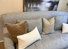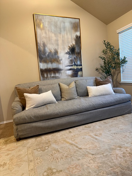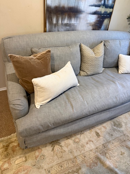 This is the “English Roll Arm” collection from RH. It’s in great condition. Normal wear. No rips or stains. All covers are washable. Cushions are down which makes it super comfortable. Bench seats that fits up to 3 people comfortably. Beautiful neutral color. I don’t know the exact name of it but looks more blueish gray.