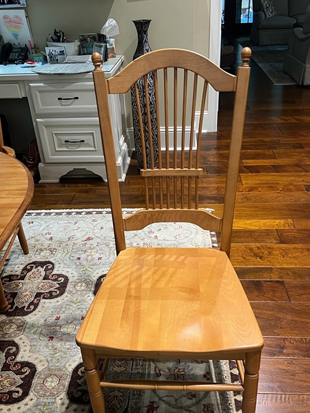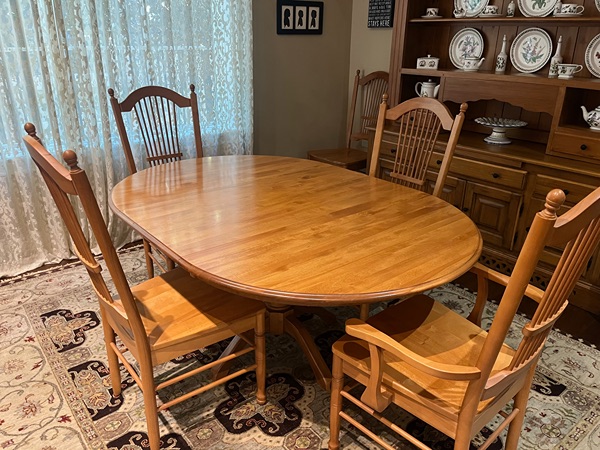 Light Maple 45" Round Pedestal Table with 20" leaf that extends to 65" oval.  Set comes with 2 arm chairs and 4 dining chairs.  In excellent condition!