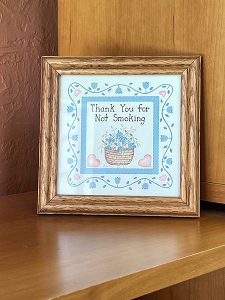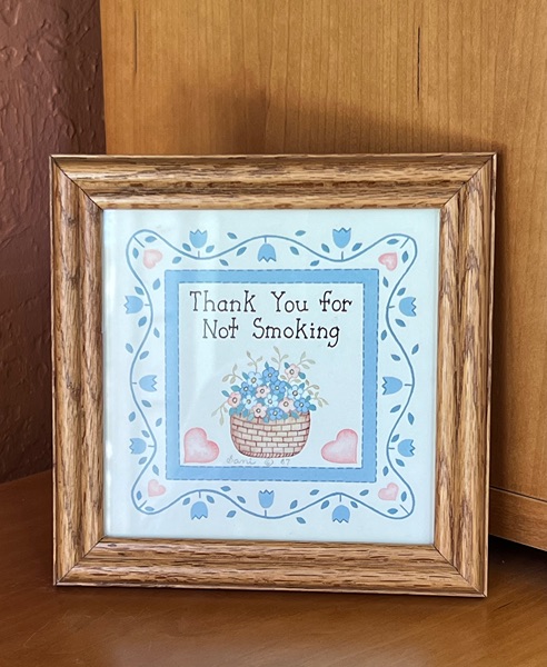 Vintage framed glass sign with floral design ‘Thank You for Not Smoking’. Excellent, like new condition! Great for home or office. Approx. 6 1/2” square…$12 firm