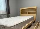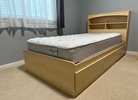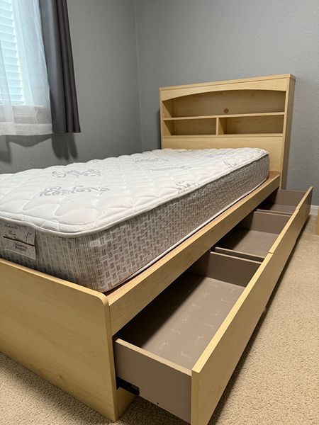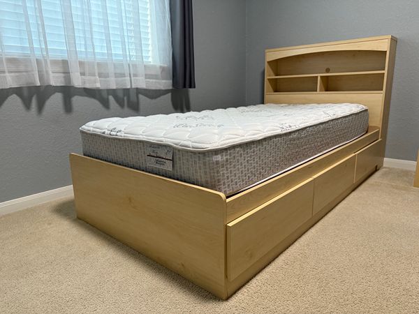 - Twin-size bed frame with 3 storage drawers and bookshelf headbord