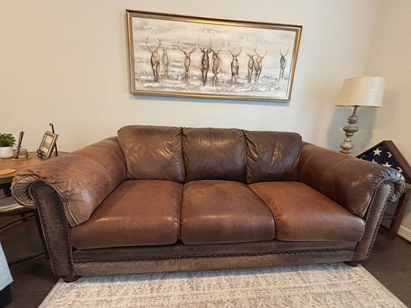 Lane Leather sofa and loveseat. Brown, great quality and condition, comfy, cozy, and stylish with nailheads.