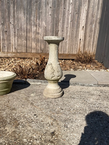 This could be used for a bird bath or potted plant with a drainage hole. It has a slightly raised bump in the center top. 24"Hx~8.5" base.
