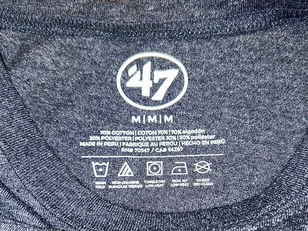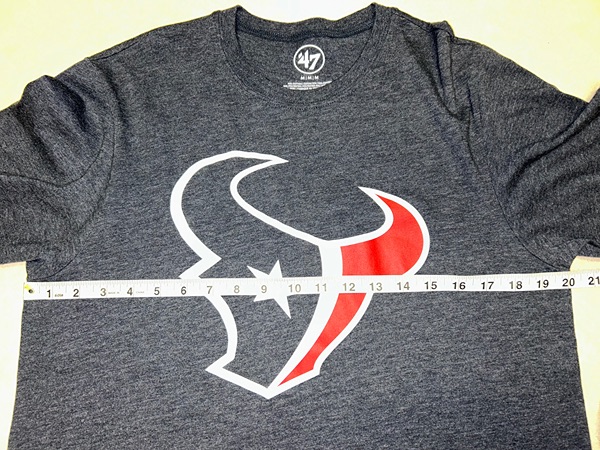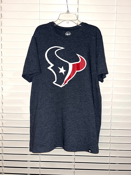 Men's 47 brand short sleeve NFL t-shirt, size medium. Shirts is in overall very good condition with intact Toro graphic, no holes, no tears, and no unsewn seams. There is a small spot that's not really obvious (see pic of shirt in window) unless you are looking very close (see pic with measuring tape--it's just visible above the number 17). Smoke free home. $3