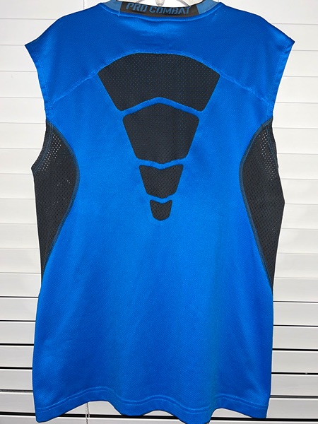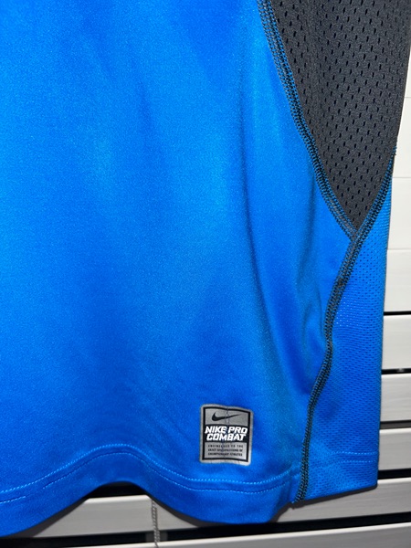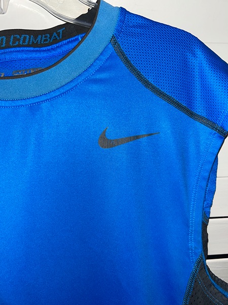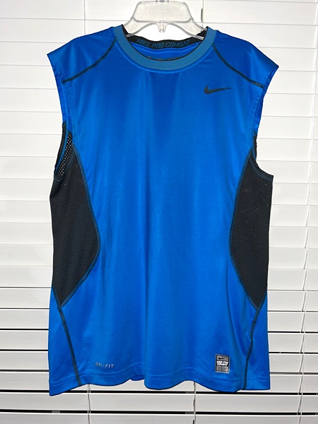 Nike men's medium sleeveless performance tank top featuring Dri-Fit technology and mesh panels for breathability. Item does show some wear, including cracks in the graphics (pictured) and a small snag near the front bottom (look above number 21 on the measuring tape). Overall, it's in good condition with no known tears, stains, or unsewn seams. Smoke free home. $4