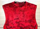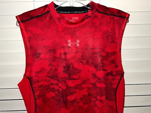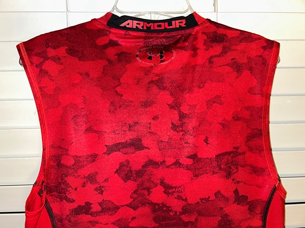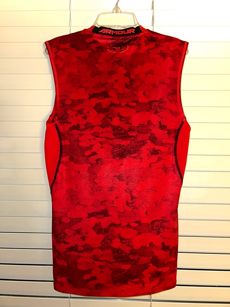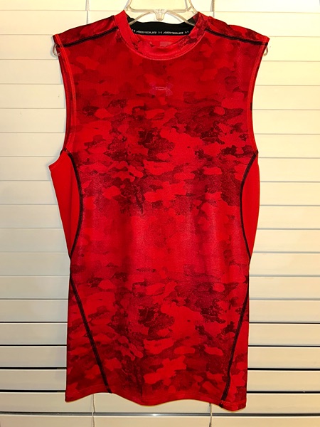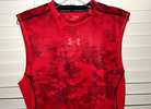 Under Armour men's red camo compression sleeveless tank top, size medium, snug fit. Structurally, the shirt is in very good condition with no known holes, tears, stains, odors, or unsewn seams. However, the black ink on the front logo and tag has come off, and it's about half gone on the back logo (all pictured). Smoke free home. $4