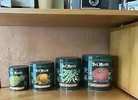 Vintage metal nesting canister set I believe from the 1970s or there about. These were made in England, for the Del Monte Company, by Sundara Industries in San Francisco, California. These are made in the likeness of a can of Sliced Hawaiian Pineapple, Solid Pack Tomatoes, Whole String Beans and Yellow Cling Peaches. They range in size as follows: Flour (Tomatoes) is 7 3/4" H 7" in Diameter, Sugar (Whole String Beans) is 7" H and 6 1/4" in Diameter, Coffee (Yellow Cling Peaches) is 6" H and 5 1/2" in Diameter and Tea (Sliced Hawaiian Pineapple) is 5" H and 4 1/2" in Diameter…$50 firm