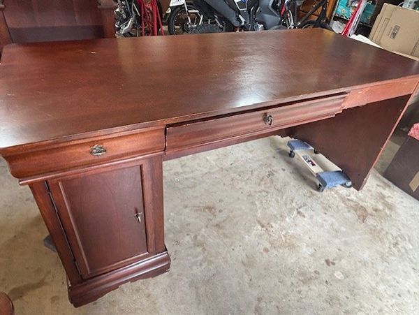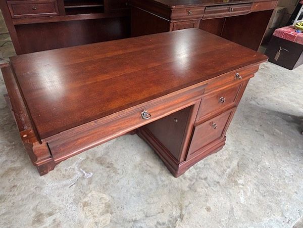 Lightly used executive L-shaped desk in a rich cherry finish with matching lighted hutch. High-quality construction with a spacious work surface, ample drawers and cabinet storage, and built-in lighting for added functionality and style.