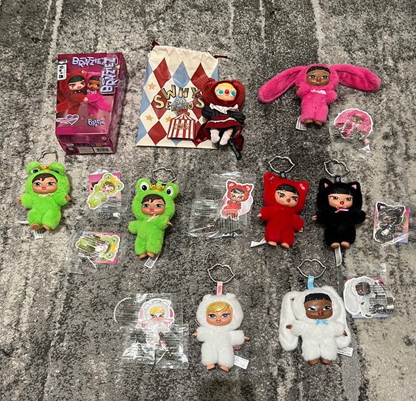 What's Available:  1 NEW and SEALED Bratziez valentines doll, 1 why so serious popmart Molly doll, 1 Bratziez valentines Sasha / Pink bunny, 2 Bratziez original Yasmin / green frog, 1 Bratziez original Jade / black cat, 1 Bratziez valentines Jade / red cat, 1 Bratziez valentines cloe / white angel 1 Bratziez original Sasha / white bunny.